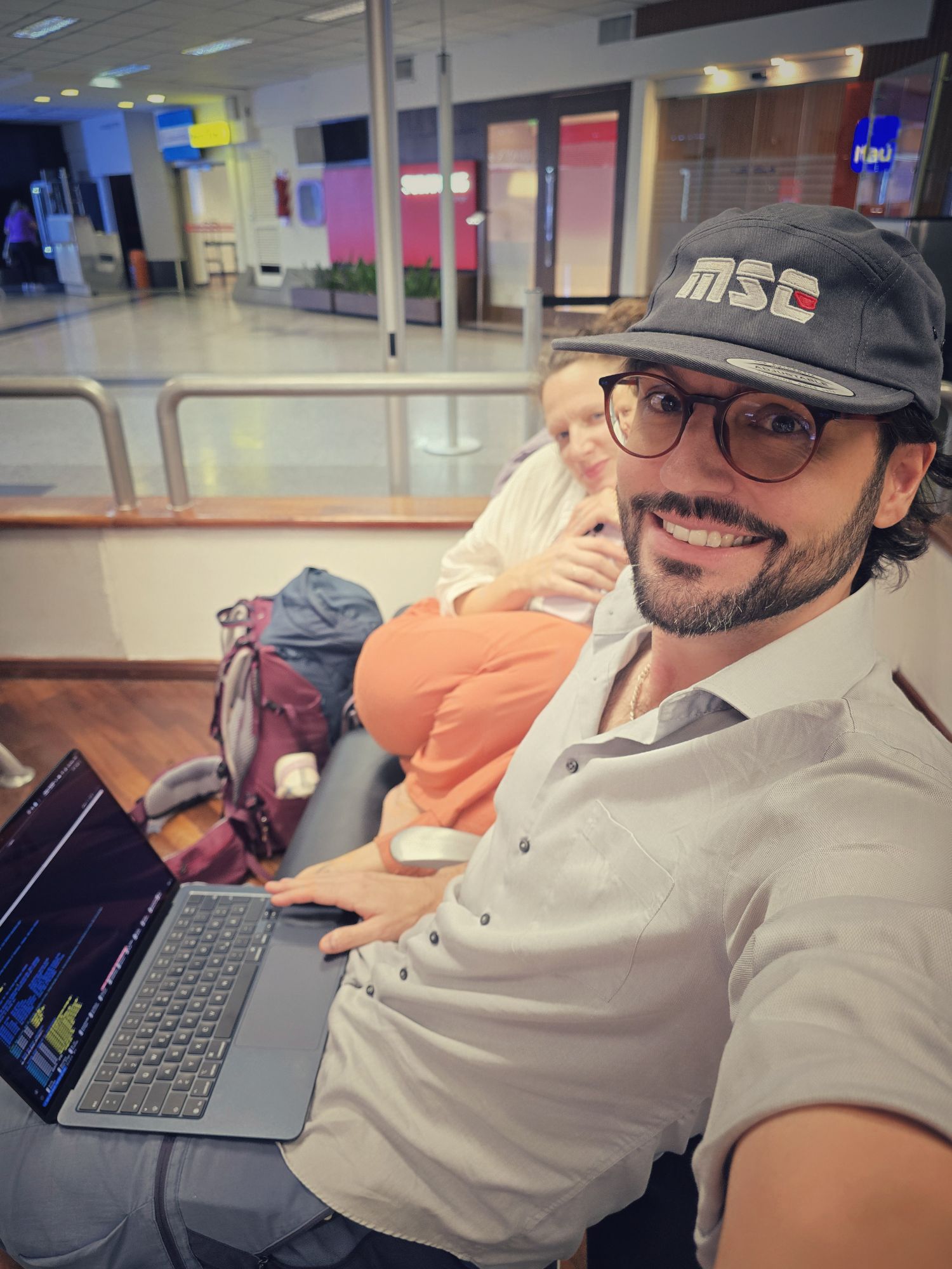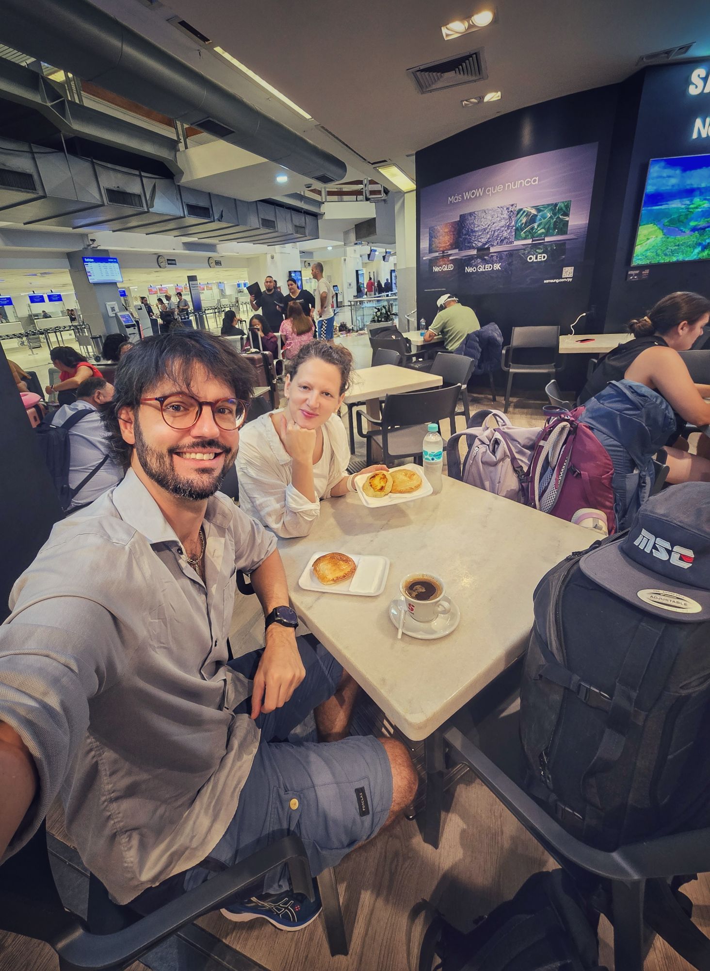 Den Check-In hinter uns gelassen, nun ab durch die Sicherheitskontrolle. Natürlich direkt auf die Sonderspur auf dem Sicherheits-Durchleuchtungs-Gepäckband. Ich hatte natürlich noch Wasser in meiner Flaschen, um der nette Dame zu zeigen, dass ich meinen flüssigen Spr***gstoff auch trinken kann, direkt die Flasche vor Ihren Augen auf ex hinunter gezogen. Nein, darüber macht man natürlich keine Späße, in der Flasche war natürlich nur WASSER 😉 Jetzt aber erstmal einen Cafe Negro bei Cafe Havanna ☕️ am Gate.